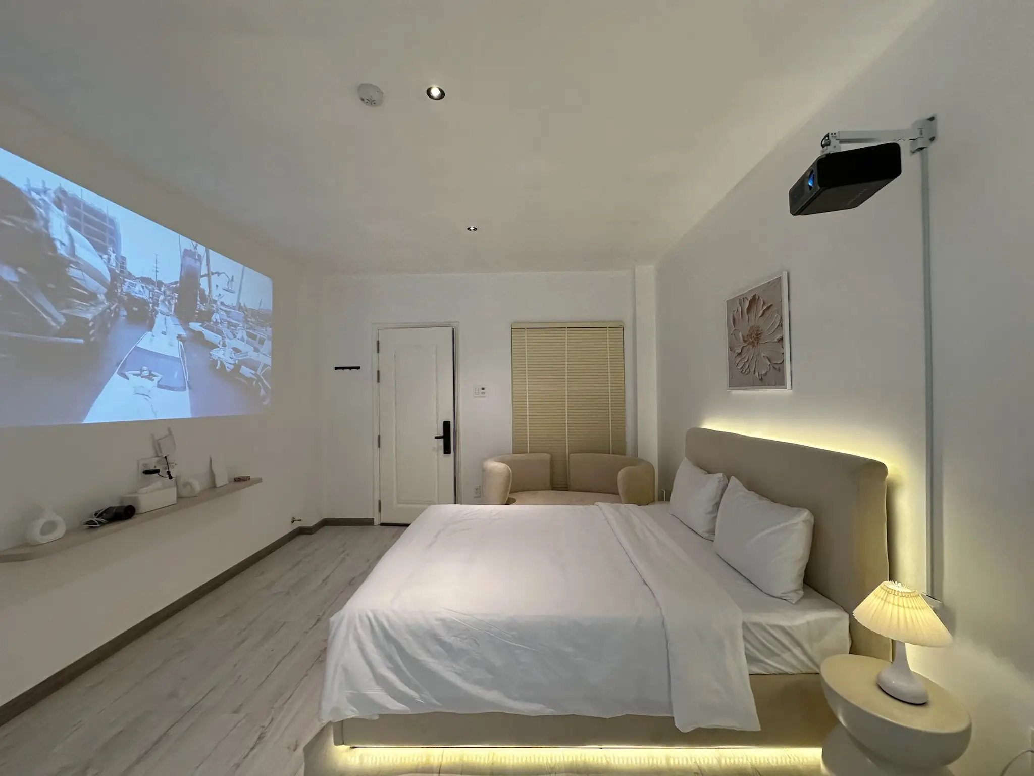 Không gian hiện đại với ánh sáng và âm thanh sống động, mang mood “điện ảnh” cùng ánh sáng xanh lãng mạn. Phòng đầy đủ tiện nghi và có cửa sổ thoáng nhìn ra ngoài.