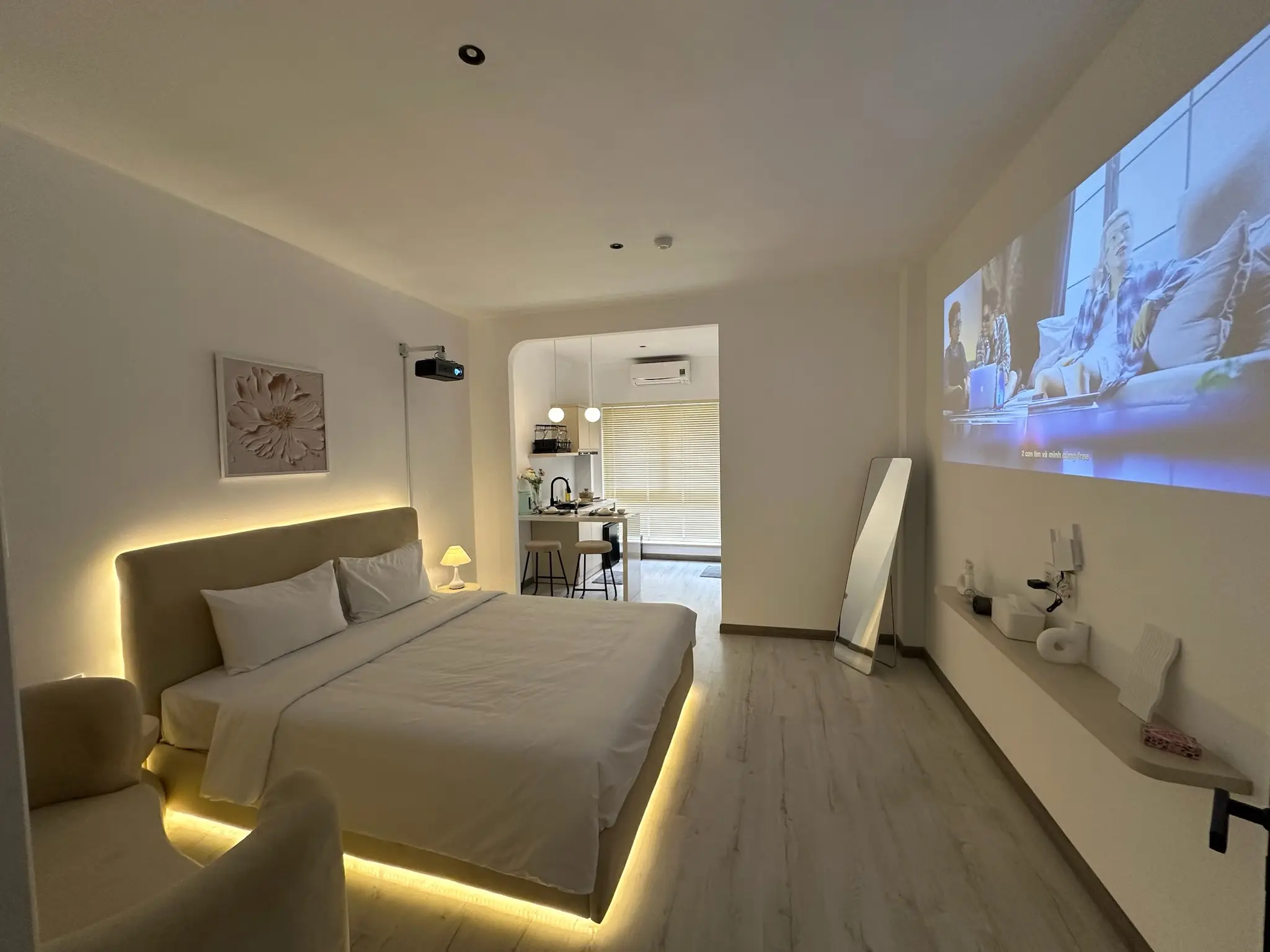 Căn phòng được thiết kế tối giản nhưng mang đậm nét hiện đại và đầy đủ tiện nghi, có bếp nấu ăn. Không gian phù hợp cho nghỉ dưỡng, công tác hoặc hẹn hò cặp đôi.