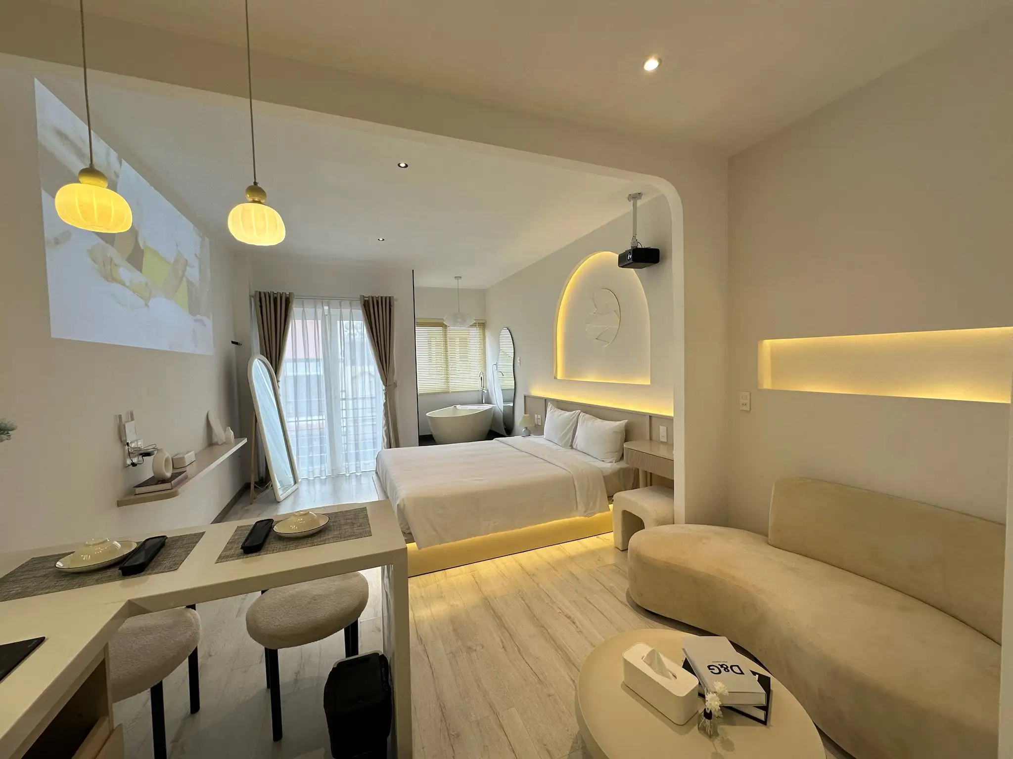 Không gian lãng mạn với các chi tiết thiết kế tinh tế, mềm mại làm điểm nhấn, sang trọng, tối giản với tone đen-trắng-kem mang lại cảm giác nhẹ nhàng. Không gian phù hợp cho chuyến công tác, hay kỳ nghỉ dưỡng.