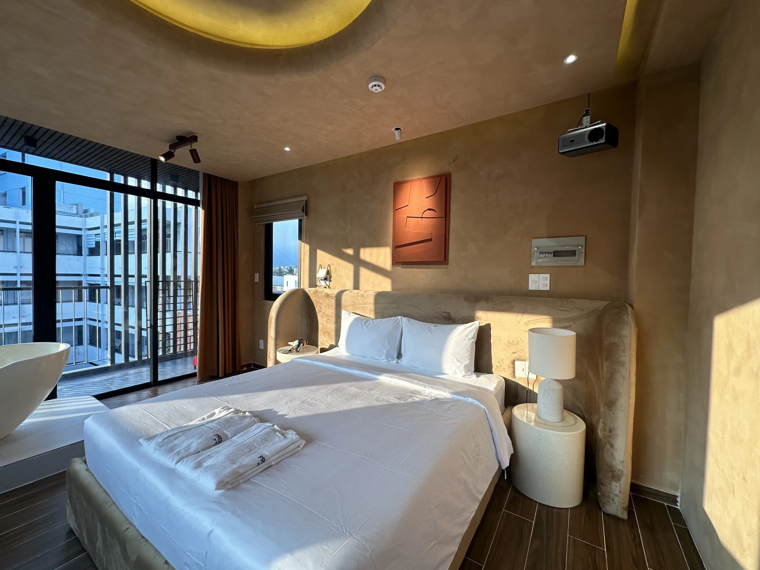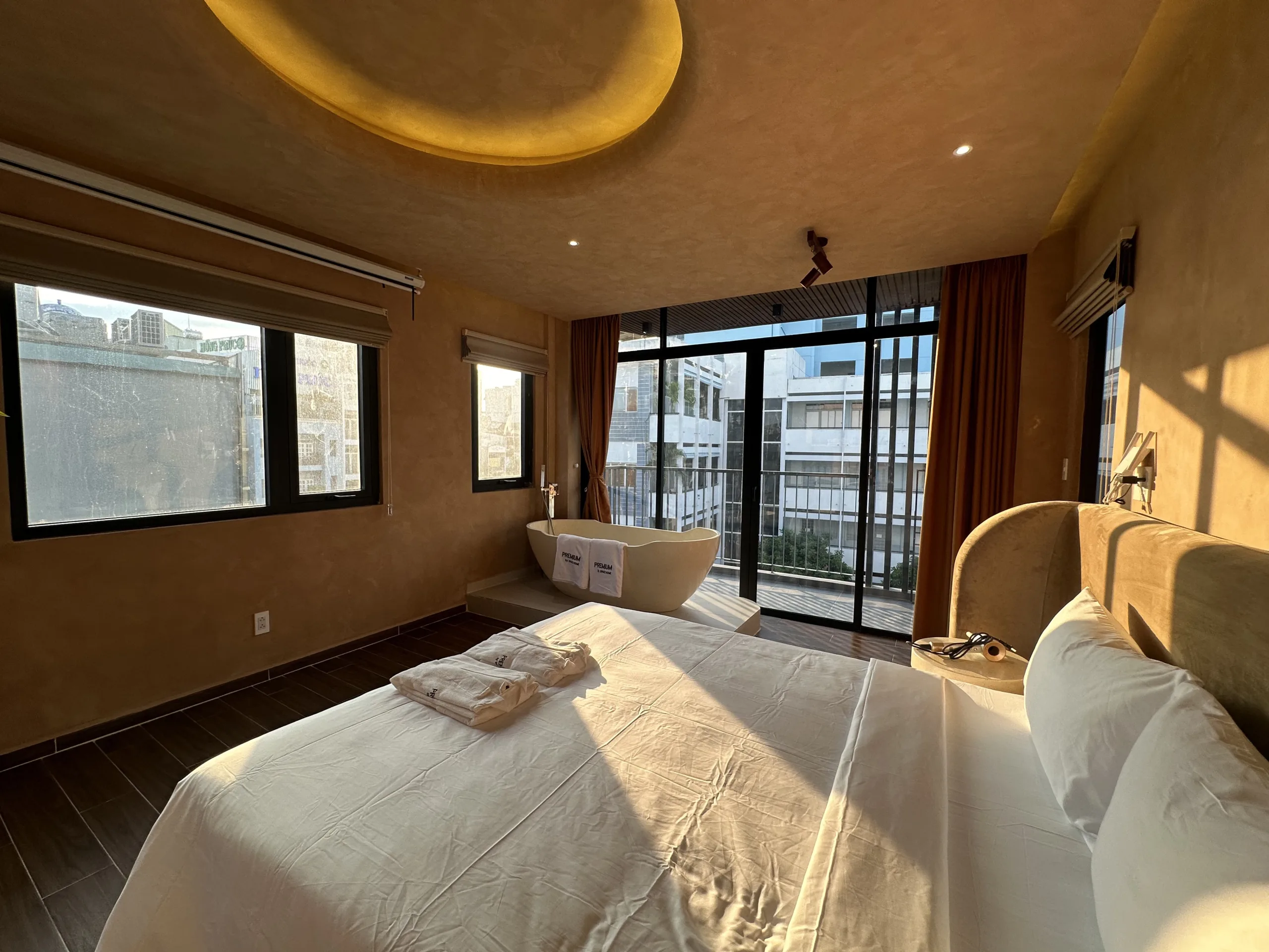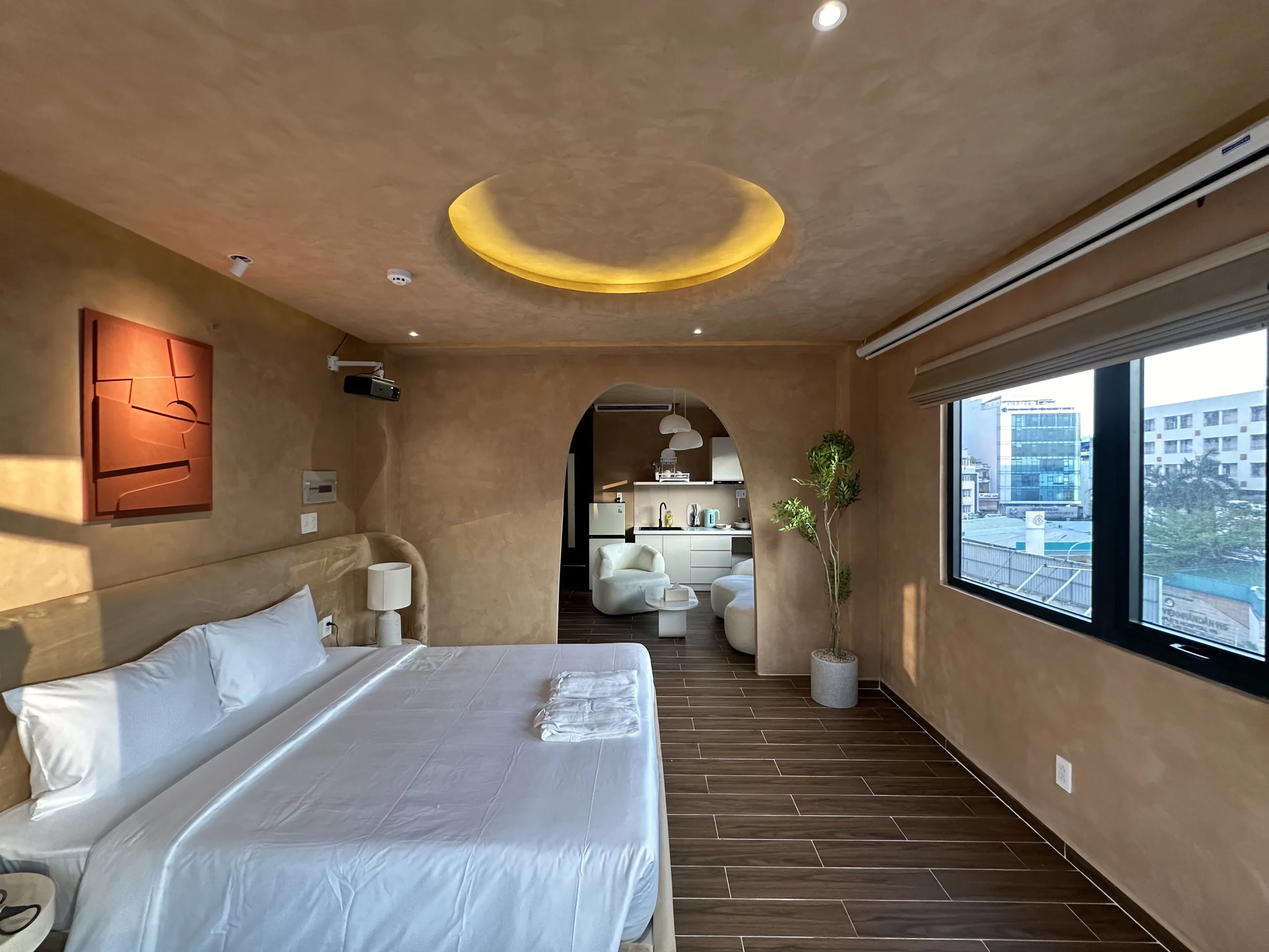 Phong cách trang trí tối giản và ấm áp với các tone màu cam-đen-trắng và thiết kế sàn gỗ mang lại cảm giác ấm cúng. Không gian phù hợp cho nghỉ dưỡng, công tác hoặc hẹn hò cặp đôi.