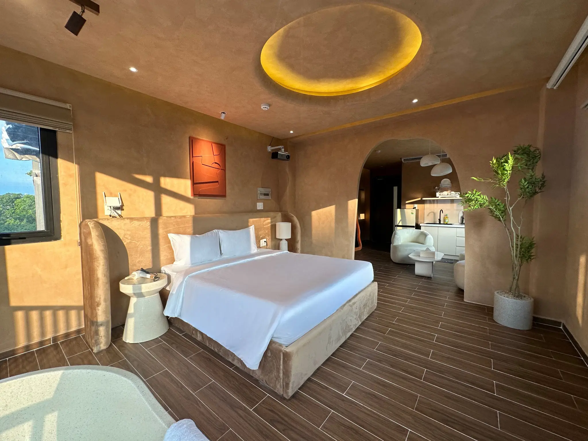 Cách trang trí hiện đại, tạo nên không gian sang trọng và nghệ thuật, thiết kế Minimalist và hiện đại cùng tông màu be và gỗ ấm áp. Có bồn tắm thư giãn, bếp nấu ăn và ban công thoáng.
