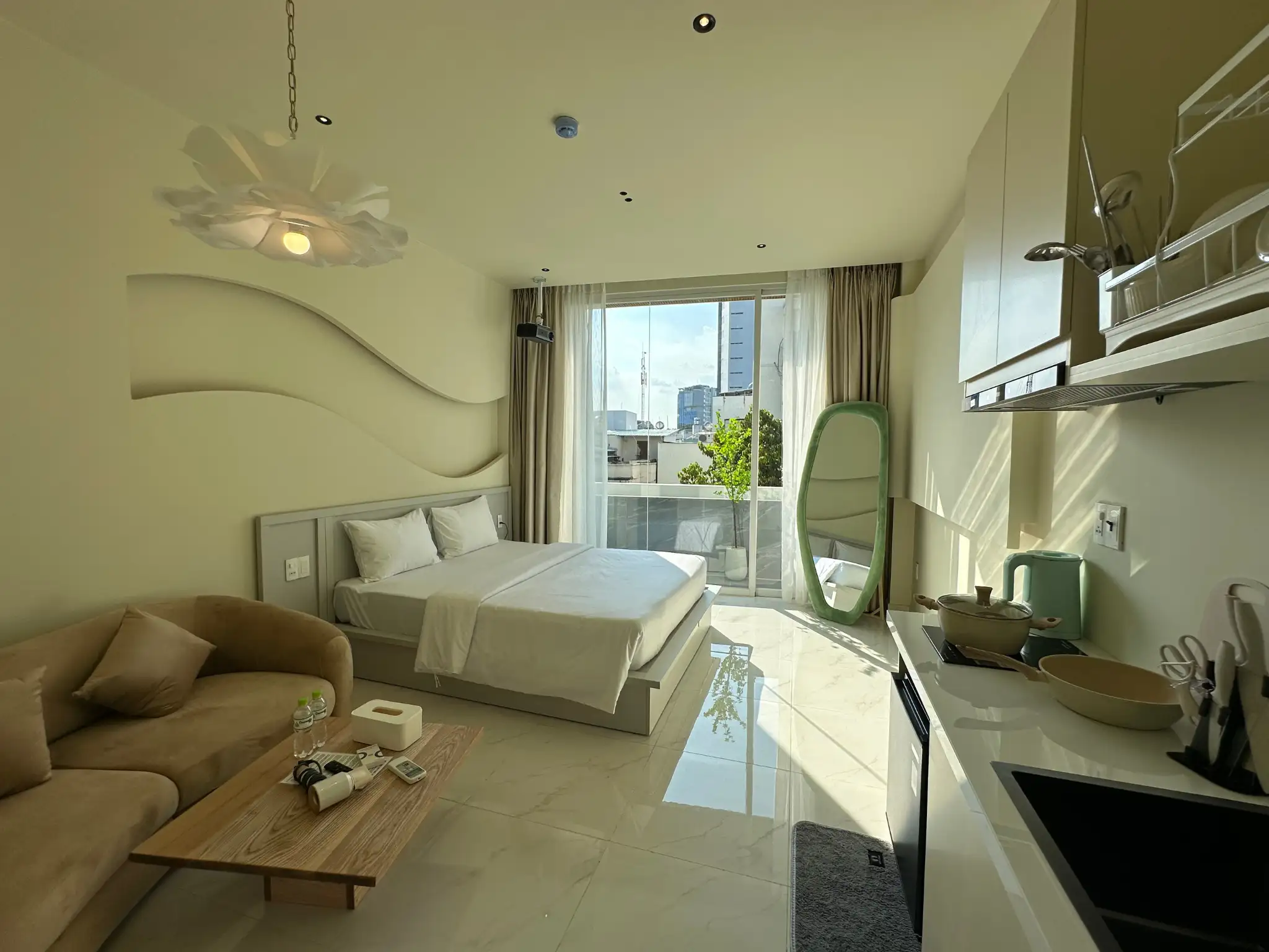 Thiết kế Minimalist cùng màu kem, trắng và ban công rộng, thoáng mát nhiều cây xanh. Không gian phù hợp cho khách nghỉ dưỡng, công tác hay hẹn hò cặp đôi.