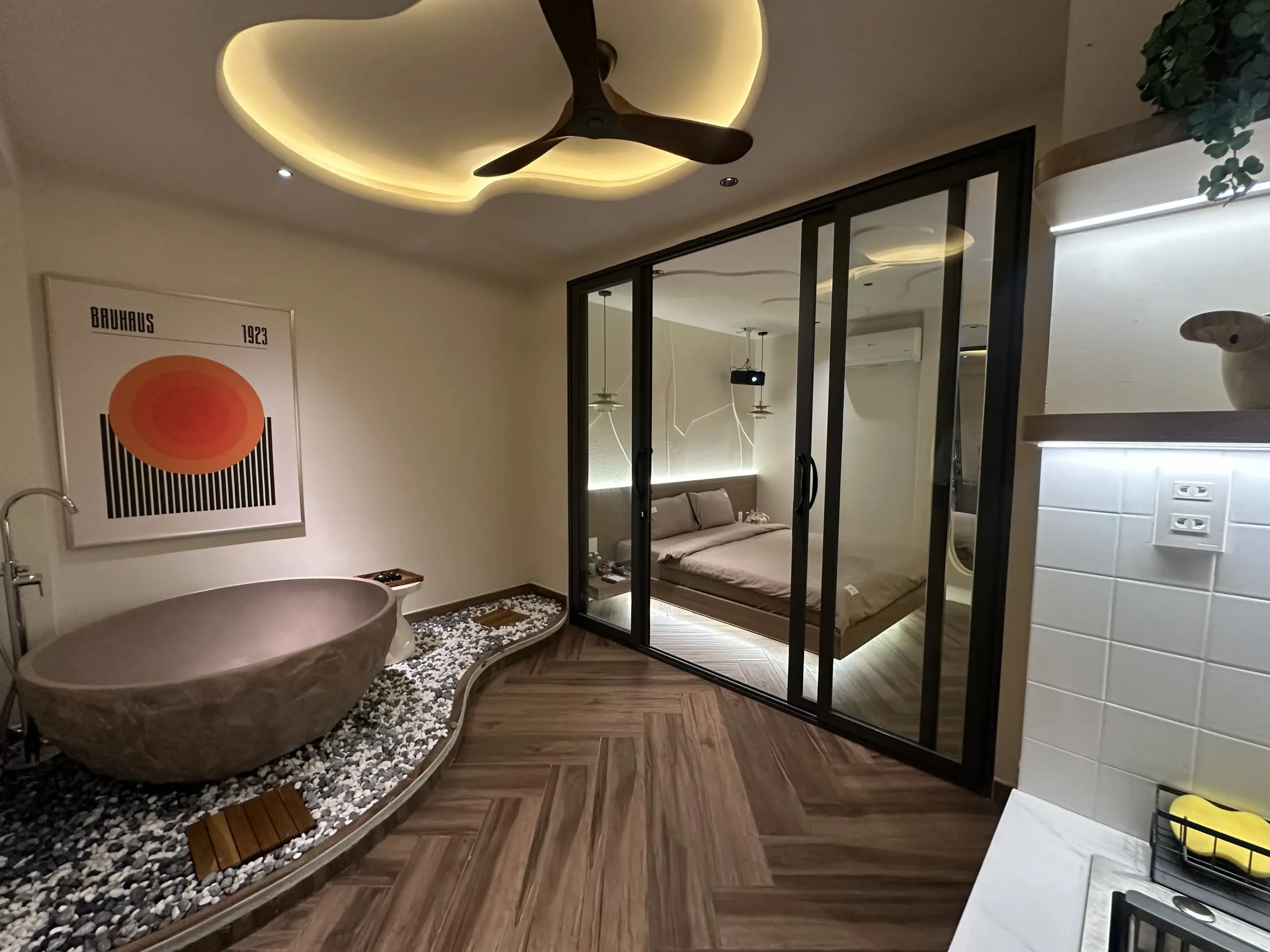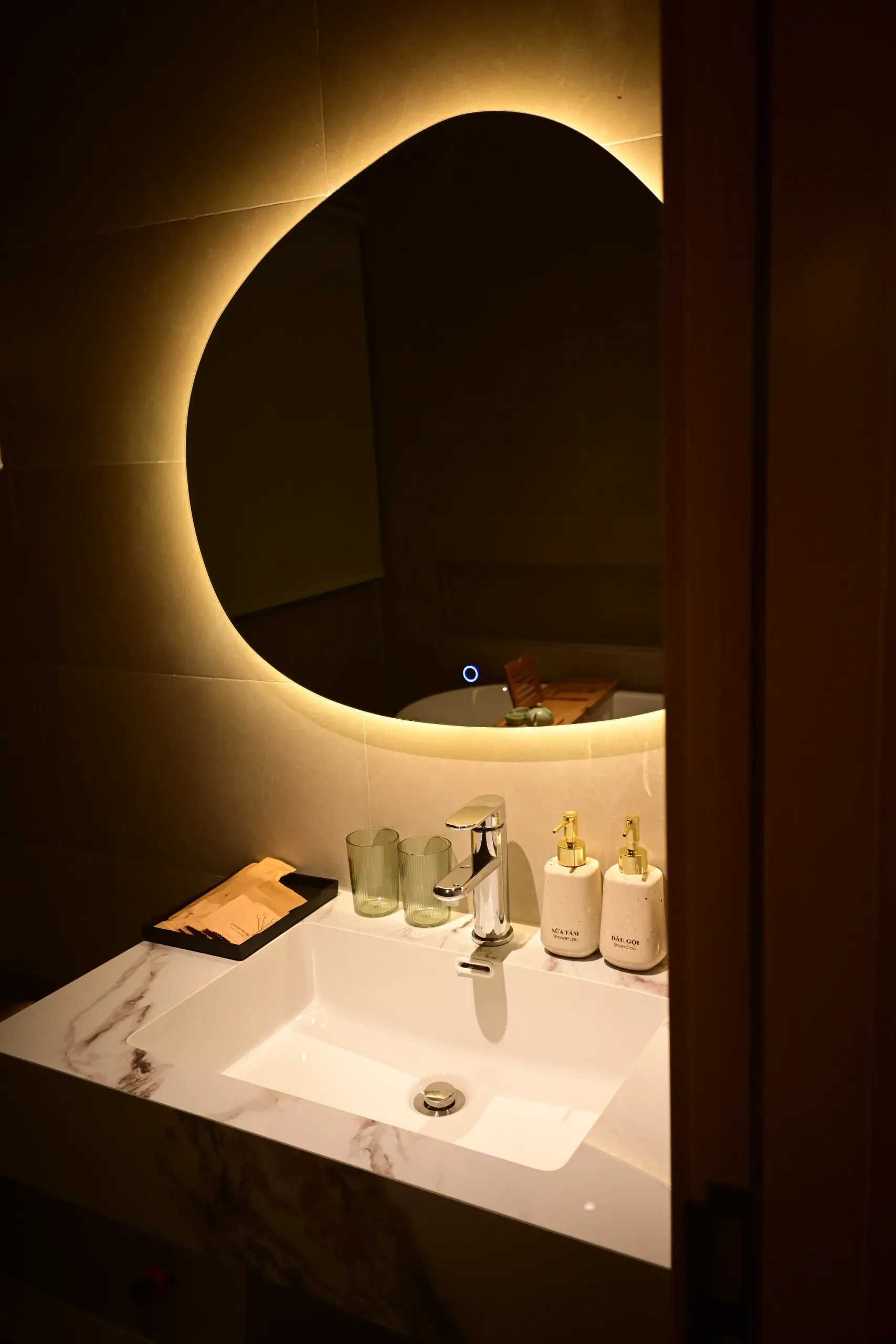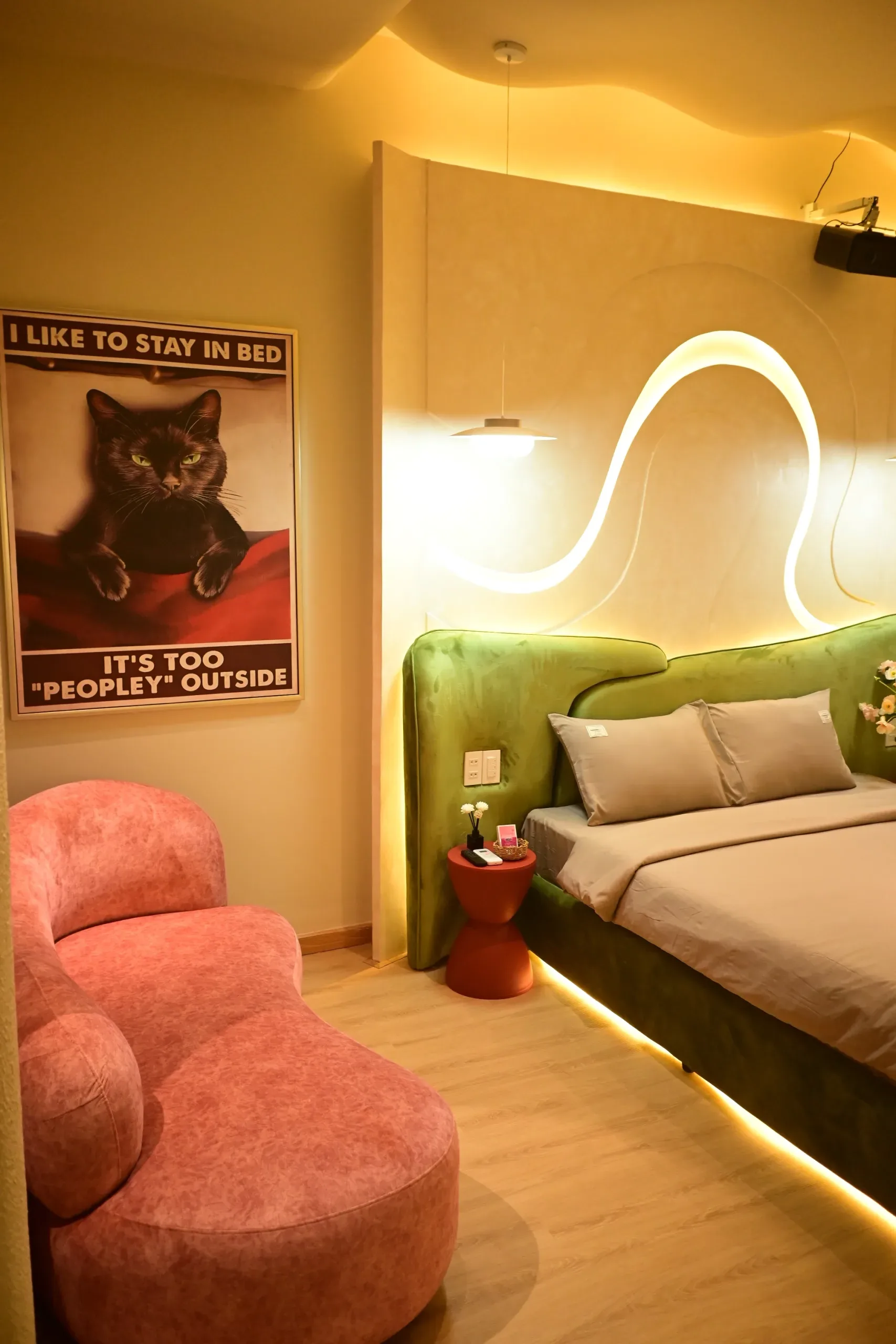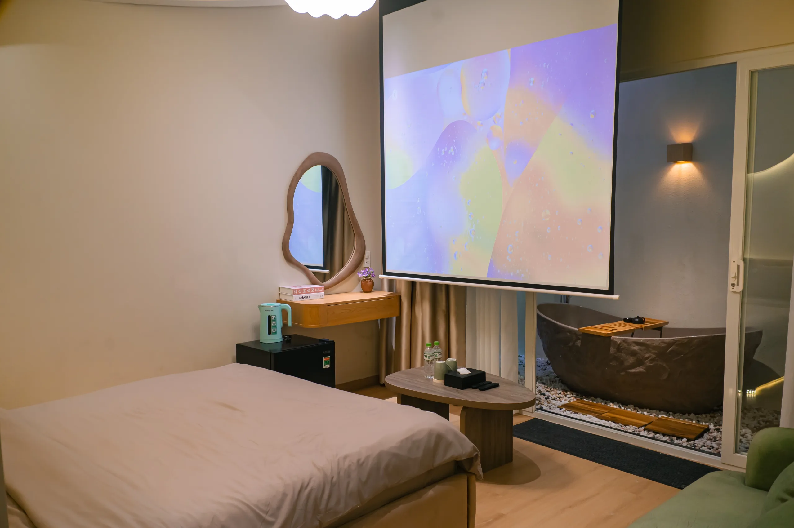 Không gian ấm cúng, hiện đại tràn ngập ánh sáng tự nhiên với cửa sổ thoáng. Được thiết kế tinh tế và tiện nghi với bàn trang điểm cạnh cửa sổ, không gian phù hợp cho trải nghiệm hẹn hò, công tác và nghỉ dưỡng.