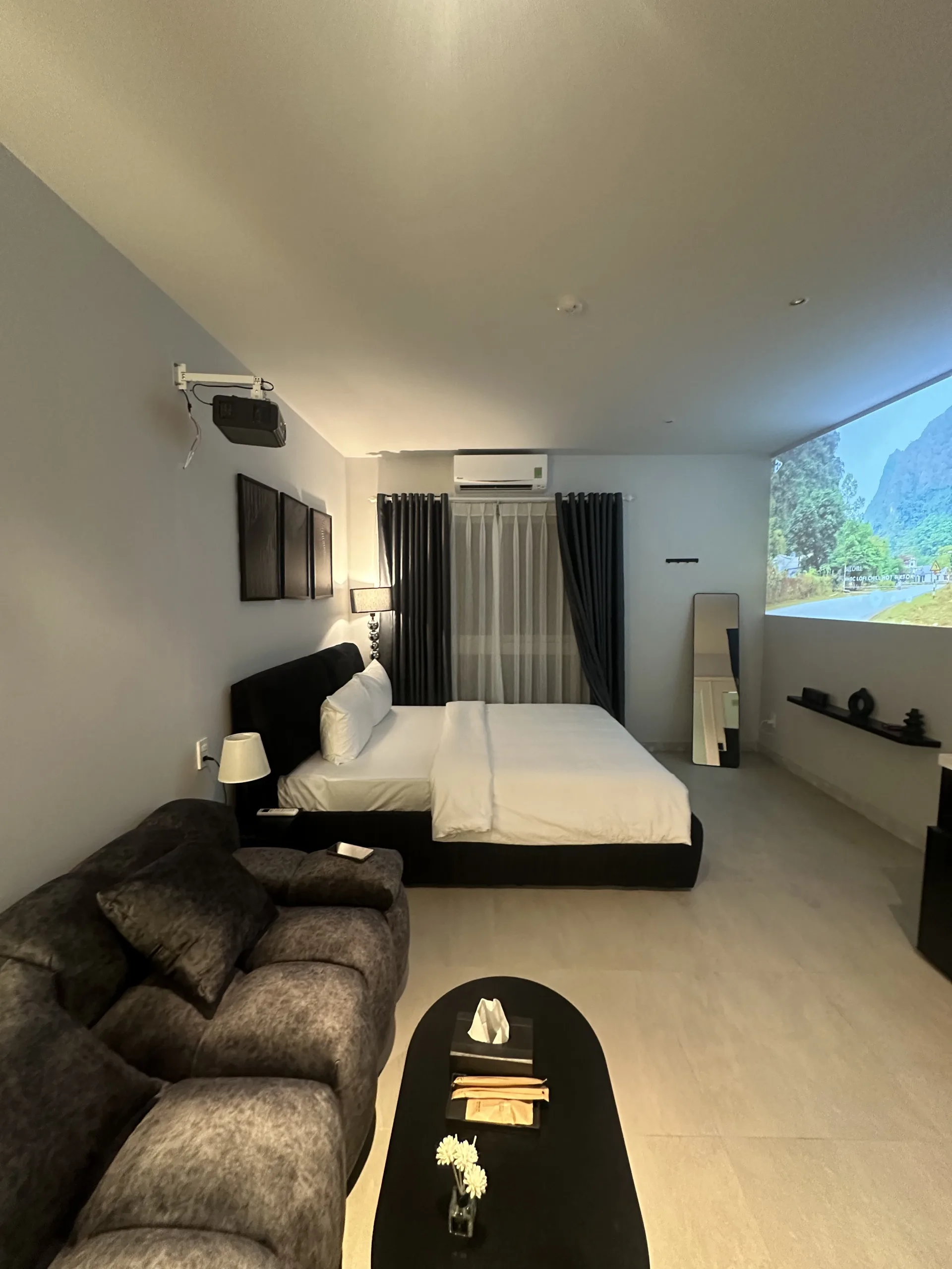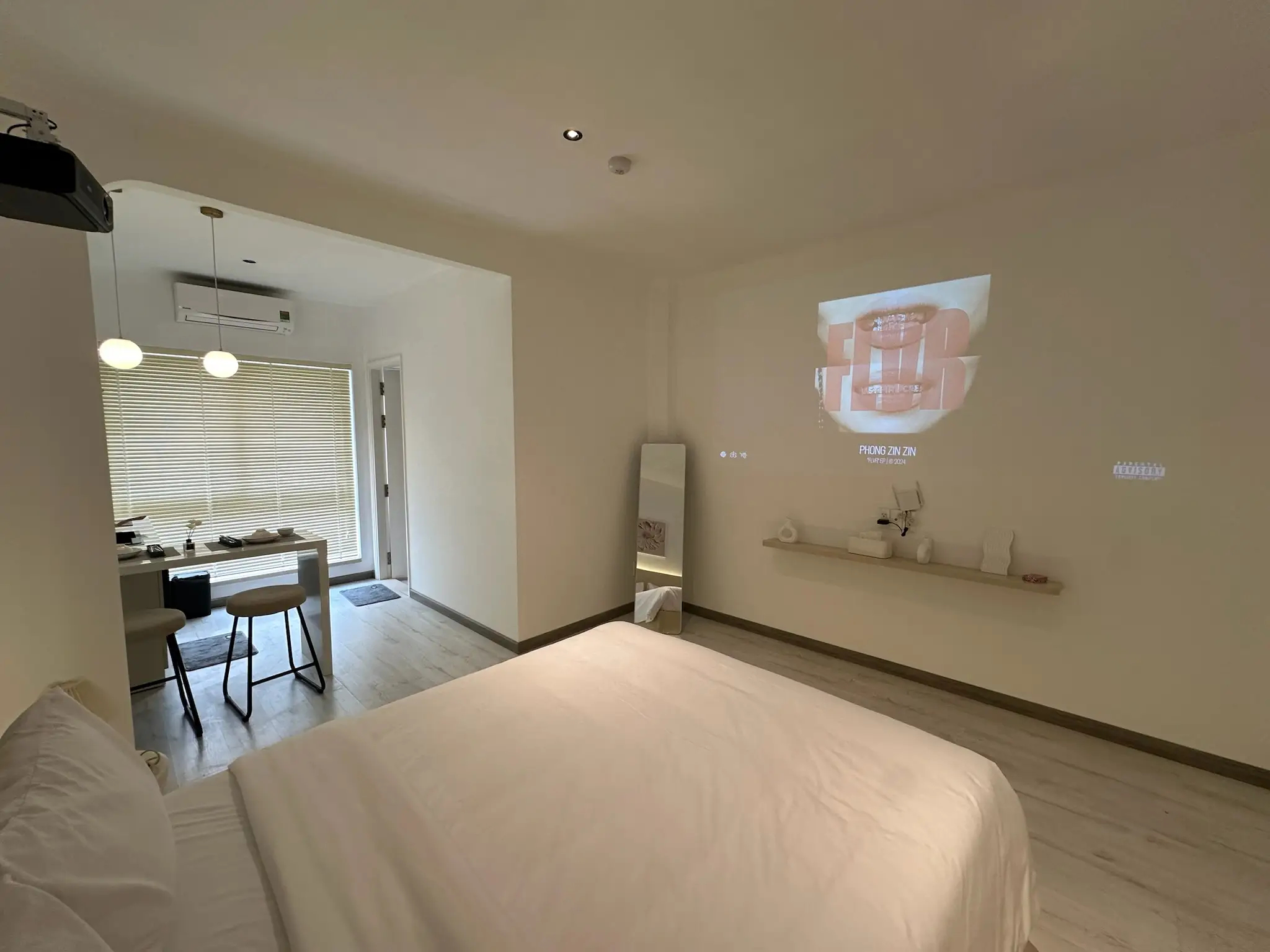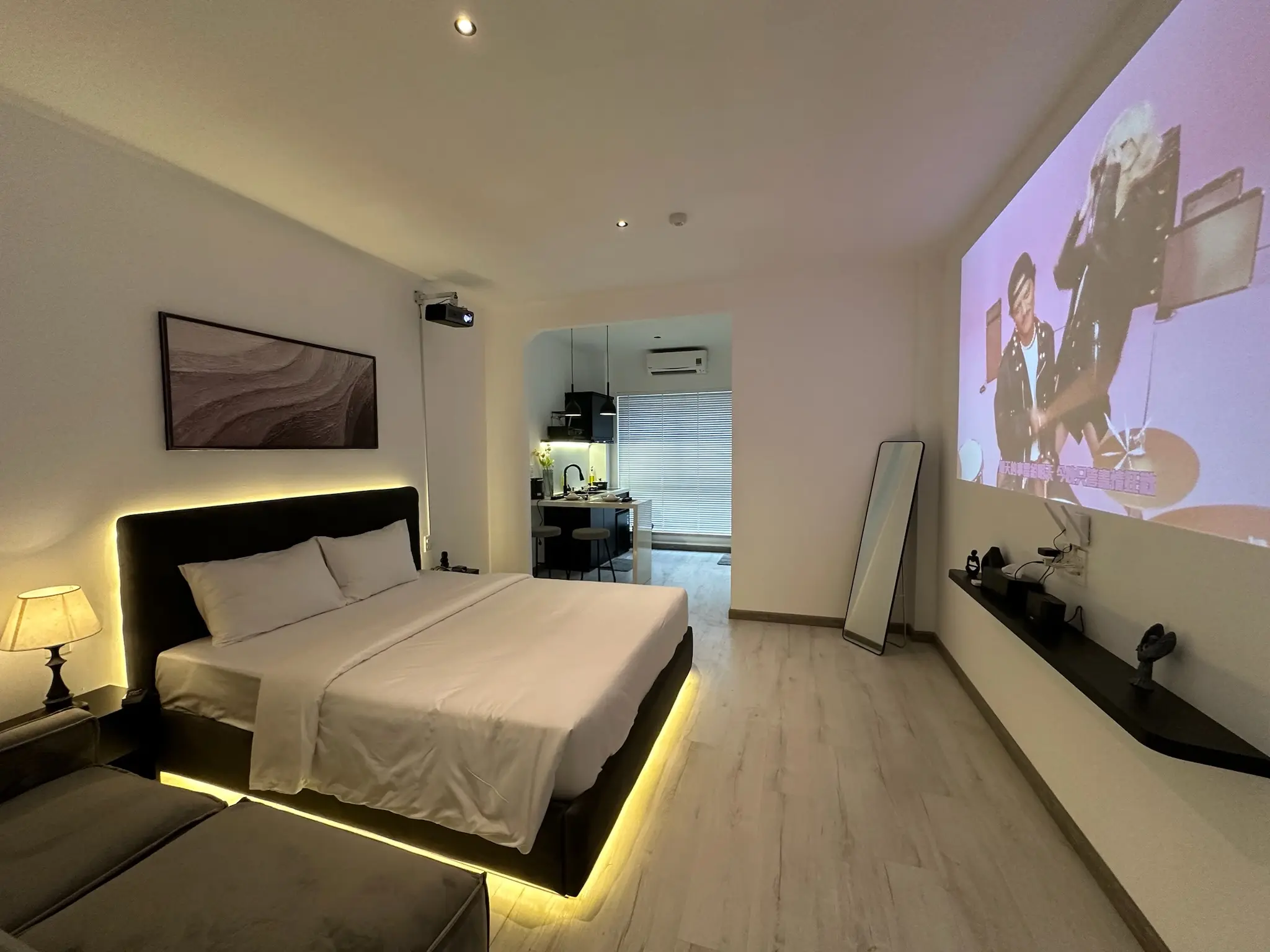 Căn phòng được thiết kế tối giản nhưng mang đậm nét hiện đại và đầy đủ tiện nghi, có bếp nấu ăn. Không gian phù hợp cho nghỉ dưỡng, công tác hoặc hẹn hò cặp đôi.