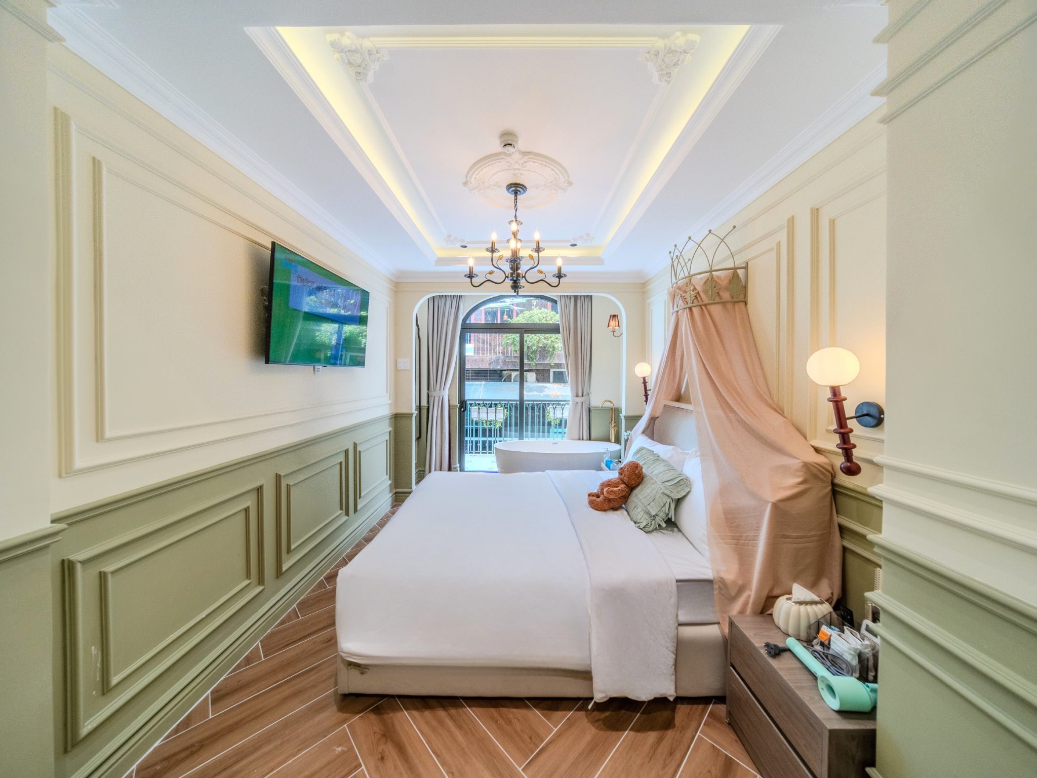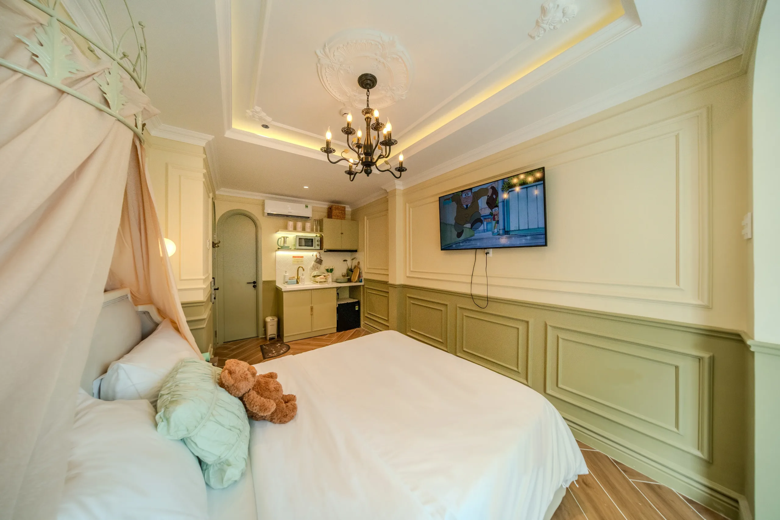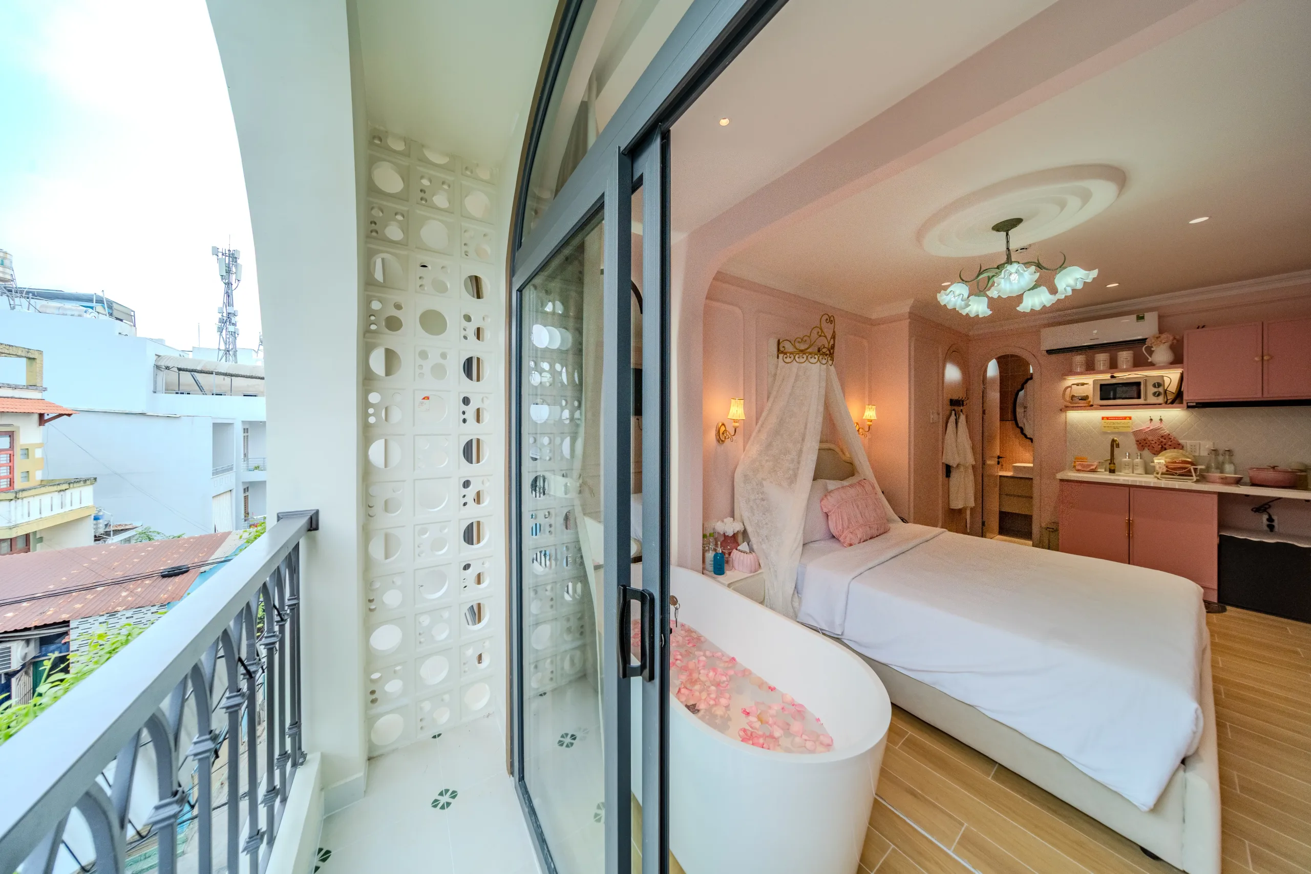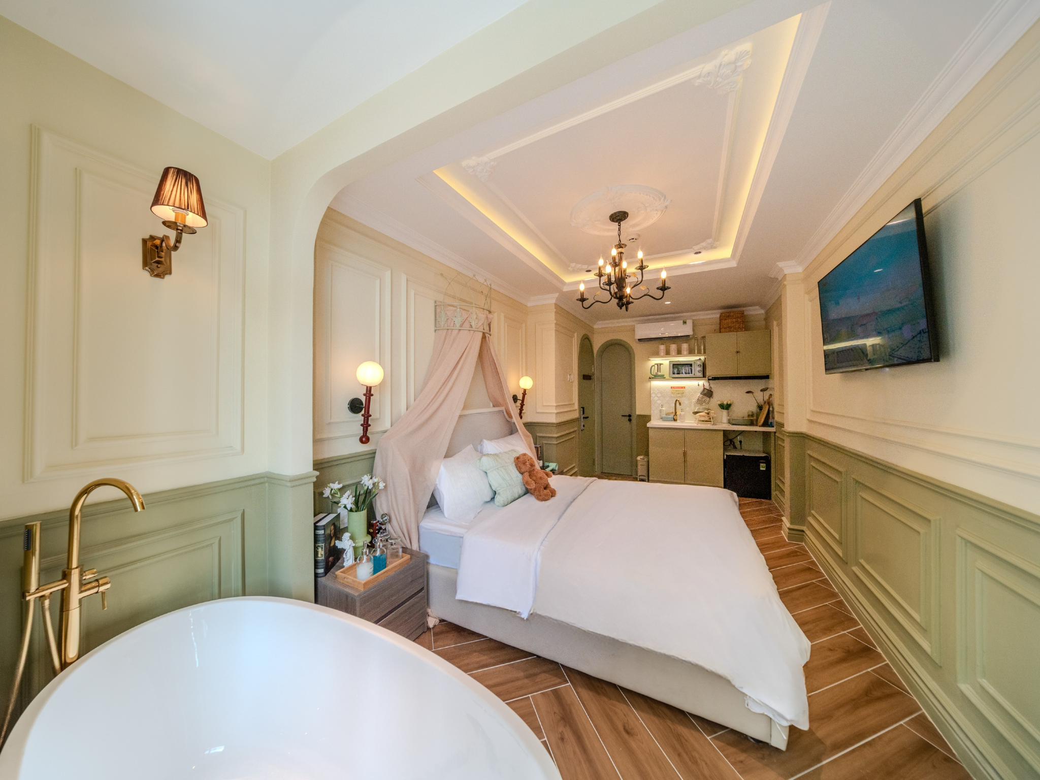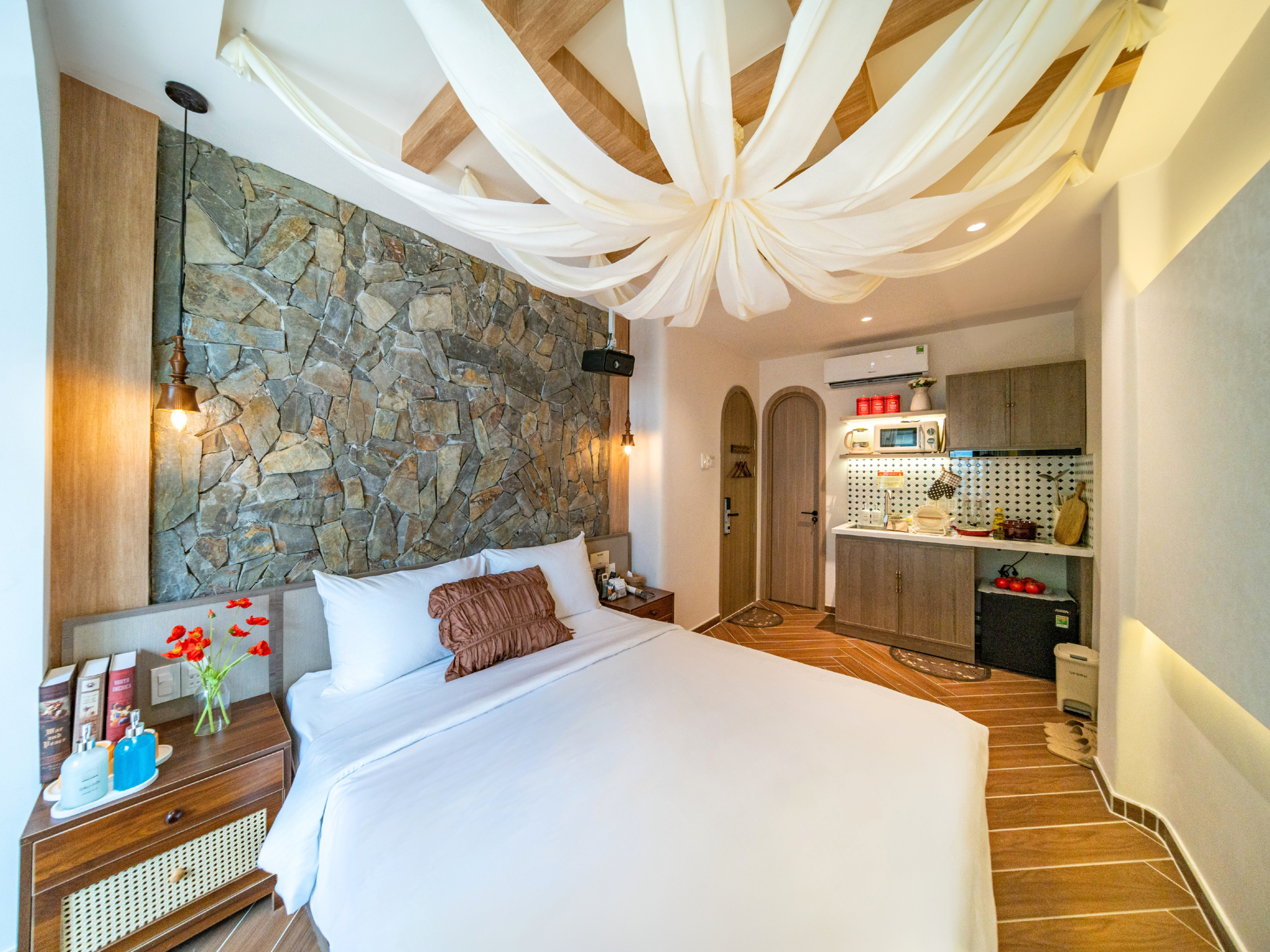 Trải nghiệm không gian nghỉ dưỡng đa sắc thái ngay tại trung tâm! Từ sắc Hồng lãng mạn với bồn tắm sang chảnh, chất Mộc ấm cúng với mảng tường đá tự nhiên, đến sắc Xanh mint trẻ trung hiện đại; mỗi phòng đều trang bị đầy đủ bếp mini và tiện nghi cao cấp. Hãy chọn cho mình một “màu sắc” yêu thích để tận hưởng những giây phút thư giãn tuyệt vời nhất.